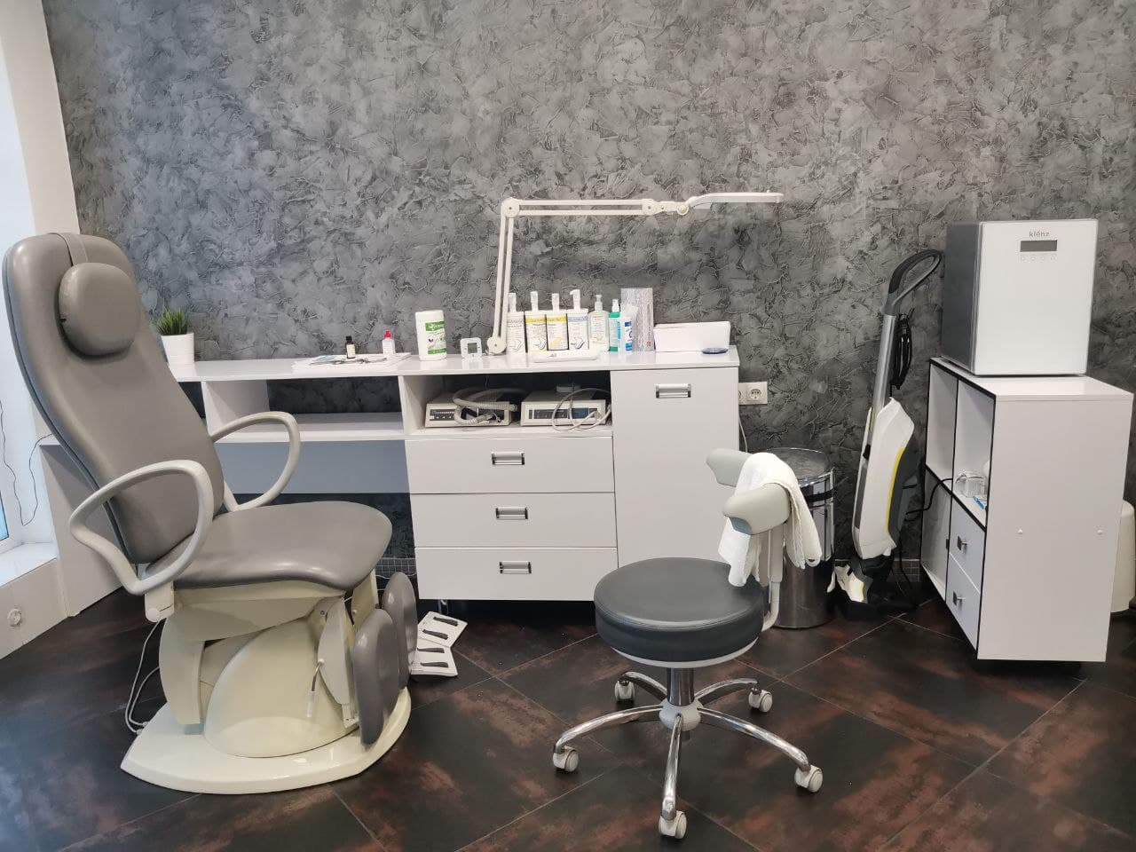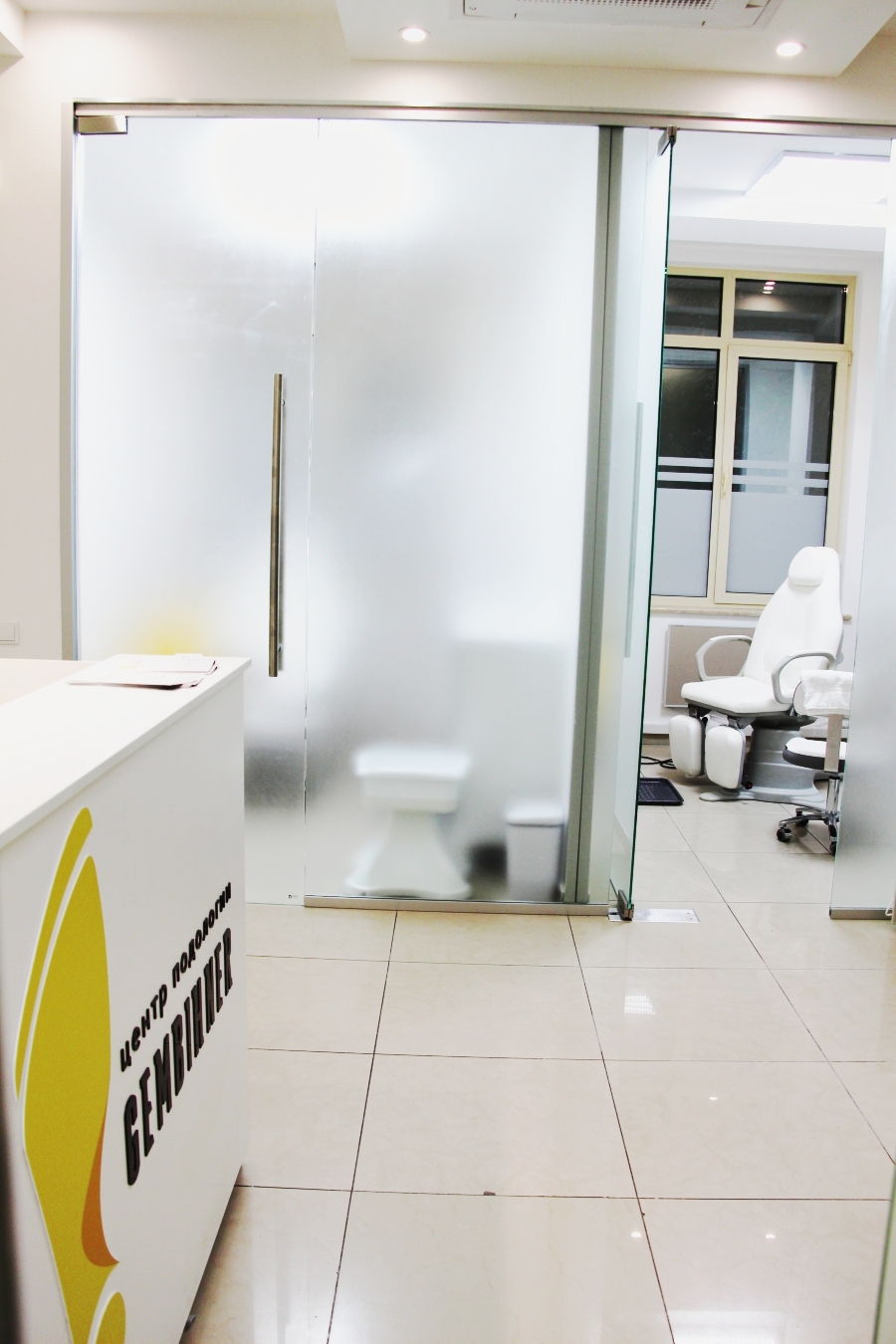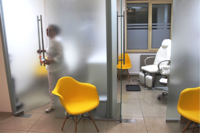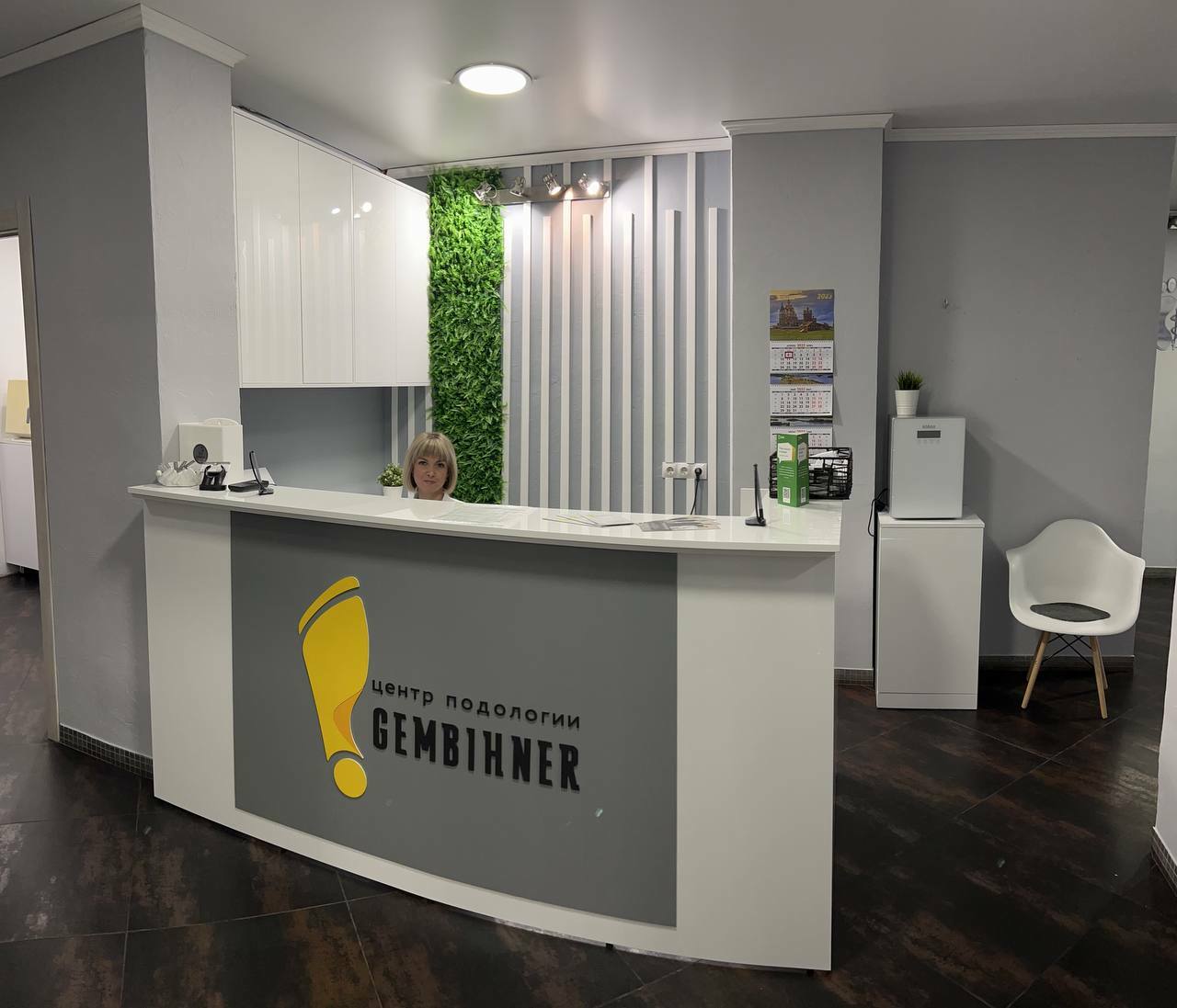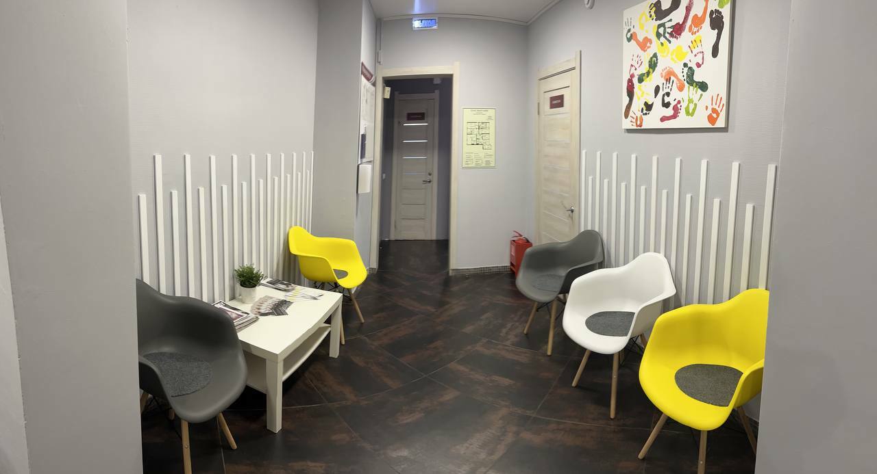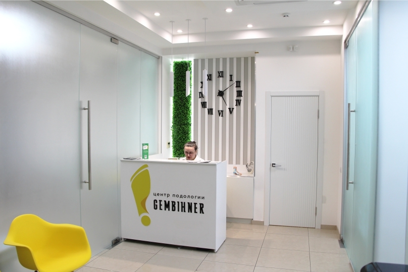 Уютный ресепшн и зона ожидания. Часть центра занимает конференц зал для обучения подологов в